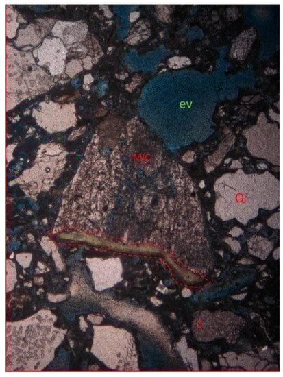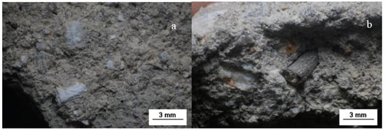 It should be mentioned that feldspars, often partially altered to clay minerals, are ubiquitous (see Figure 8). Therefore, petrographic analysis confirms our interpretation of macroscopic features shown by whitish friable spots, well distinguishable from the mortar matrix. By means of dyeing, several empty spaces were highlighted, some of which appear to be due to loss of materials during sample preparation.