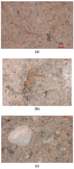 The mortar samples analyzed present similar aspects (Figure 3a). They are all composed of a fine, amorphous matrix that is light gray to light beige, containing relatively large crystals visible to the naked eye. Among them, milky to colorless quartz is dominant, with various shapes, but mainly elongated. Another phase is clearly observable: spherical grains with rounded edges and slightly pinkish grains of K-feldspars with rounded edges are also visible. Voids occur in all samples. In addition, there are friable, whitish grains with various forms, usually submillimetric. Finally, relatively large grains of opaque phases may also be present in the mortar samples.