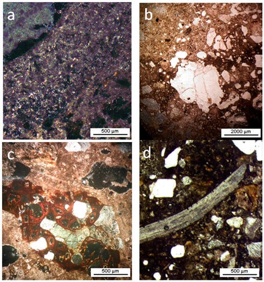 Ochre staining can be seen around some minerals (Figure 5c). An important aspect of sample S-001 compared to all the others is the presence of shell fragments (Figure 5d), which are different in shapes and sizes.