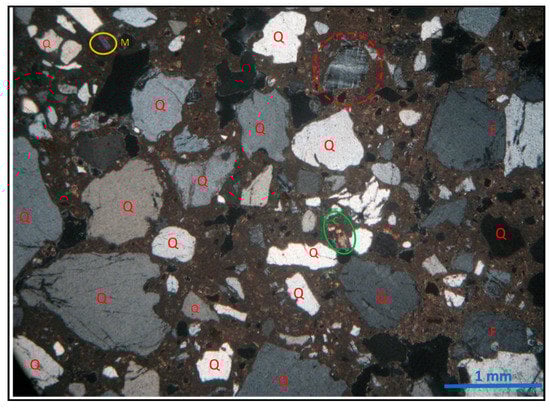 The sample S-004 (Figure 7) shows a very fine mortar matrix and brownish coloration in polarized light. Among various mineral phases, there is a predominance of spherical, angular to subangular grains—less than 0.5 mm in length—of K-feldspar (microcline) showing the typical cross-hatched twin pattern (Figure 7, red dotted circle), sub millimetric, rounded habit, sometimes with altered edges. Some plagioclases were also observed. The presence of heavily rounded calcites, with altered edges, and muscovite fragments, slightly larger than those present in other samples (for example, S-006), were also found. It is noteworthy that garnet was identified in the thin section of sample S-005.