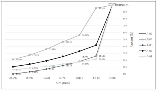 Reconstitution of mortar by Teutonico’s (1988) [30] method (widely used around the world) is presented in Table 4. Although this strictly applies to mortars with fine or very fine grain size (clay or silt), the granulometric analysis of our samples indicated the presence of a low percentage of fine particles (with equivalent diameter less than 0.297 mm), and according to this granulometry, the equivalent diameter of particles smaller than 0.2 mm may also be fine sand.