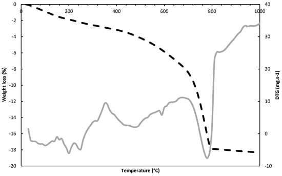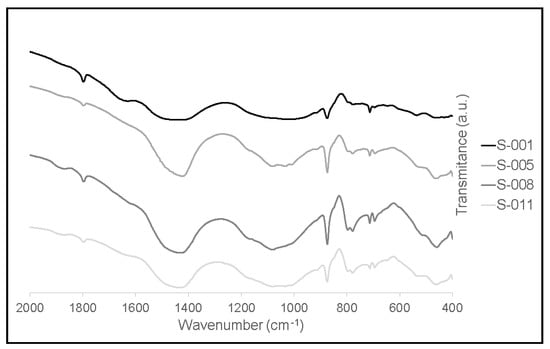 The highest mass loss (sample S-004) may be attributed to the decomposition of carbonates, in accordance with LOI contents (Figure 13 and Figure 14).