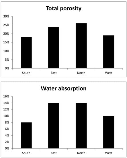 Physical properties of the analyzed mortars like porosity and water absorption at atmospheric pressure are highly dependent on the amount of voids (Figure 11). The porosity of samples varies between 14% and 33% and the water absorption between 7% and 21% by weight. Mortar samples taken from the South and West sides give very similar results after these physical analyses. Samples from the East and North sides have higher values for total porosity and water absorption.