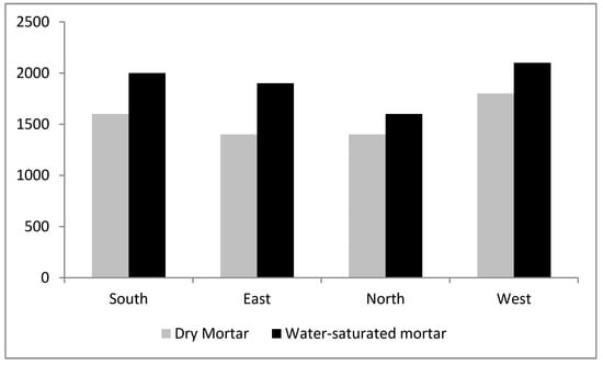 Figure 12 shows the apparent density of the samples S-001 (South), S-005 (East), S-008 (North) and S-011 (West). The average values of measured dry and water-saturated apparent density are of, respectively, 1761 kg·m−3 and 1993 kg·m−3, respectively. All samples from the Museum presented apparent density values compatible with those reported in the literature [18]. It is important to mention that physical properties can be influenced by many factors, such as typology of aggregate, typology of binder, aggregate/binder ratio, degradation phenomena, and weathering.