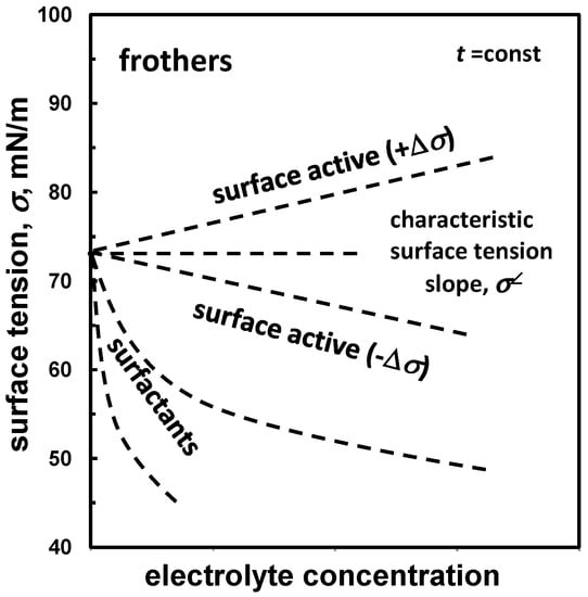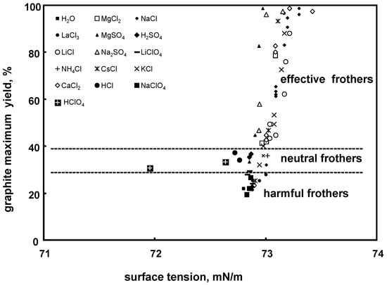 Pugh et al. [32] investigated flotation of graphite, which is a medium hydrophobic material, in the presence of different inorganic salts. Their data, replotted by Ratajczak and Drzymala [62] (Figure 12) as the yield after a certain flotation time and the surface tension of aqueous solution caused by the frother evidently shows, that there are groups of inorganic frother: effective, neutral, and harmful, resulting from positive (Δσ = +), negative (Δσ = −) and none (Δσ ≅ 0) change of the surface tension with the inorganic frother concentration, respectively. This type of flotation was confirmed in other papers [63,64].
