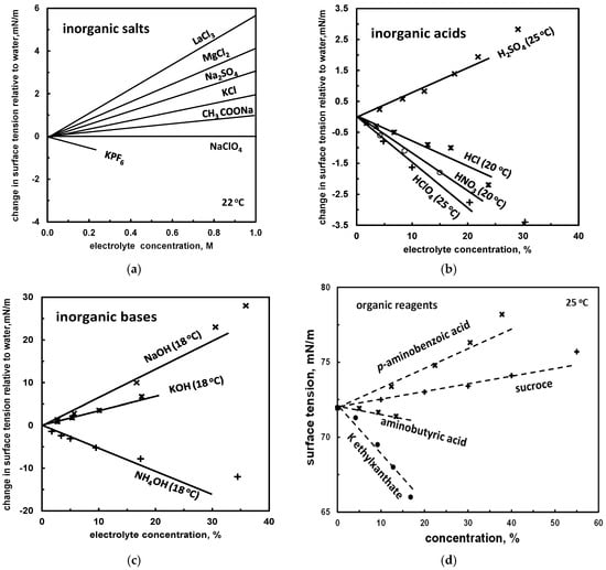 Slope of surface tension of aqueous solution of selected organic and inorganic reagents, (a) inorganic salts [32]; (b) inorganic acids [19]; (c) inorganic bases [19]; (d) organic reagents ([19,33], assumed solution density 1 g/cm3).