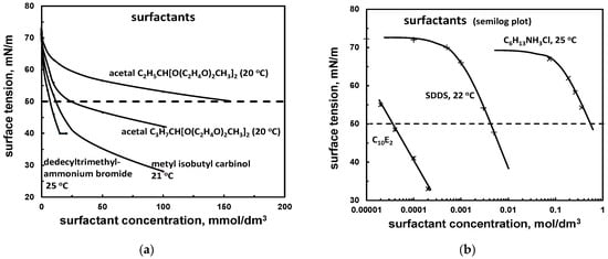 Surface tension of aqueous solution of selected surfactants and cσ50 determination. (a) surfactants (acetals [37]; methyl isobutyl carbinol (MIBC) [38]; dodecyl trimethylammonium bromide (DTAB): [39]; (b) surfactants (semilog scale) (hexyl ammonium chloride: [35]; Na n-dodecyl sulphate: [40]; diethylene oxide n-decyl ether: [41]).