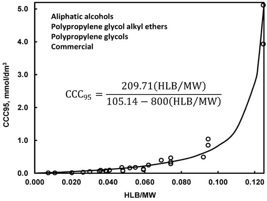 CCC95 is related to the ratio of HLB and MW by a simple equation shown in Figure 6 [42]. It means that the two-numerical value classification of frothers based on HLB and MW (Figure 1) can be replaced by a one-numerical value classification using either HLB/MW or CCC95. The values of CCC can be also predicted basing on the number of carbon in the alkyl group of the reagent [49].