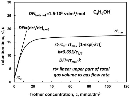 Another parameter which can be used for classification of frothers is the dynamic foamability index (DFI) [1,50,51]. DFI represents the limiting slope of the gas retention time versus frother concentration for concentration approaching zero, where the retention time is the slope of the linear part of the dependence of the total gas volume contained in the system (solution + foam) on the gas flow rate (Figure 8). The values of DFI for selected frothers were given in Table 11.