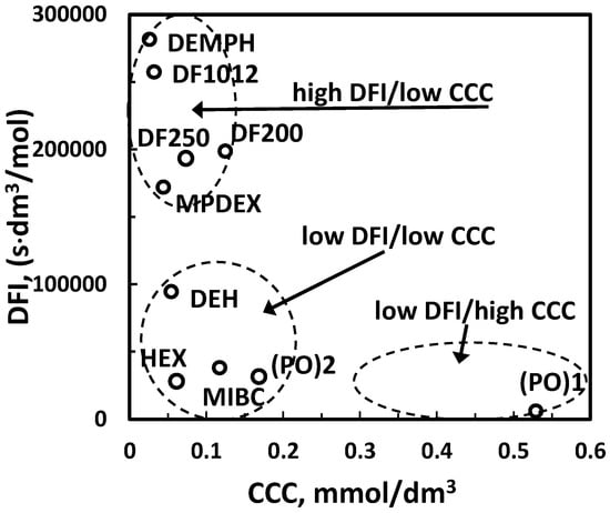 Map-type relation between DFI and CCC and two-numerical value classification of frothers in the frother/aqueous solutions/gas system (data of [16]).