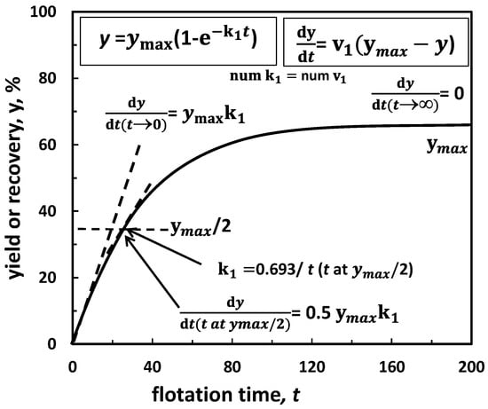 Yield (or recovery) of flotation as a function of time at a given frother concentration provides various data including yield (or recovery) trend, maximum flotation yield (or recovery) (ymax), flotation kinetics (v, k), which can be used for frothers classification in the water/gas/solid system. The case of first order process rate.