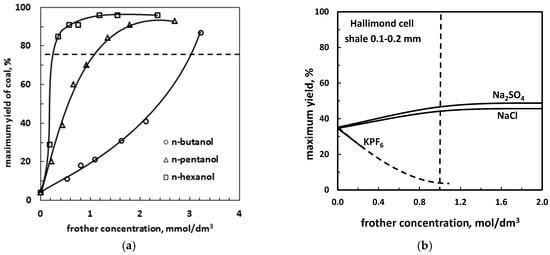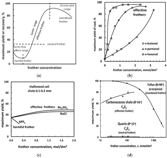 Classification of frothers into effective, neutral, harmful and overdosed (a). Examples: (b) medium hydrophobicity material (coal)/different surfactants (yield and effectiveness increase with frother concentration) (data after [50], flotation time 2.5 min); (c) medium hydrophobicity material (carbonaceous shale)/different inorganic salts (based on data of [55]); (d) differently hydrophobic materials/surfactant (based on data of [56,57]).