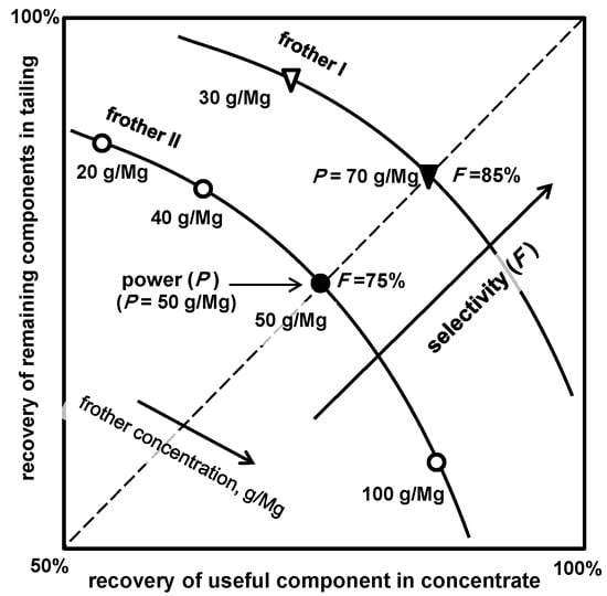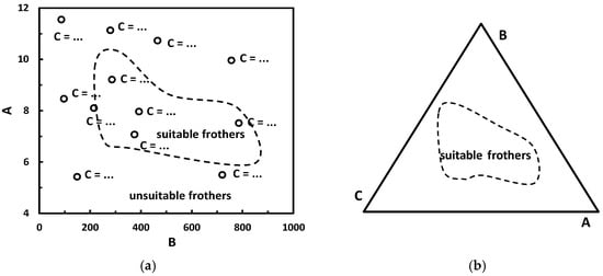 Many parameters of the liquid/solids/gas systems allow to use more than two parameters simultaneously for the classification of frothers. It could be for instance flotation selectivity, froth height and kinetic constant. When three numerical values are considered for the classification, the graphical representation of such approach can be made in the form of a Cartesian x-y plot with data points in the graph amended with numerical values of the third parameter. Another option is the Gibbs triangle [80]. Both are shown schematically in Figure 18.