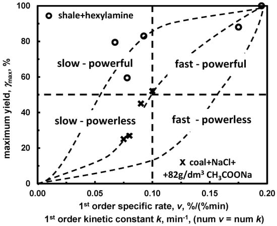 A map-type classification for the three-phase (liquid/gas/solid) system according to achieved maximum yield and n-order kinetic constant k values (based on [67]).