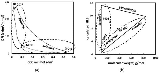 Special trend–type classifications based on relationship between selectivity and additional parameters for frothers present in the solids/gas/liquid systems was proposed by Laskowski [16,45]. They are based on the relation between trends in solids flotation and either pure state (MW and HLB) or liquid/gas system parameters such as DFI and CCC. First, the plot relating MW and HLB (Figure 1) as well as DFI and CCC (Figure 9) are created and next their numerical values are somehow related to the selectivity of flotation of either fine or coarse particles. According to Laskowski [16], frothers with low values of CCC and high DFI produce stable foams and can be used in flotation of coarse particles. They were named powerful. On the other hand, the frothers with high values of CCC and low DFI float well fine particles. They were named selective (Figure 17a). The same procedure can be applied for HLB versus MW plot and fine and coarse particles flotation selectivity data (Figure 17b).