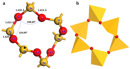 The quartz crystal space group belongs to a rhombohedral system with the starting unit cell parameters of a = b = 4.973 Å, c = 5.469 Å, α = β = 90.0°, and γ = 120.0° (see Figure 1). It is comprised of the structures of silicon oxygen tetrahedron, and the silicon atom was located at the tetrahedron center. Each silicon atom was coordinated with four oxygen atoms. The angles of O–Si–O were 110.1° and 108.7°, and the bond lengths of Si–O were 1.620 Å and 1.624 Å.