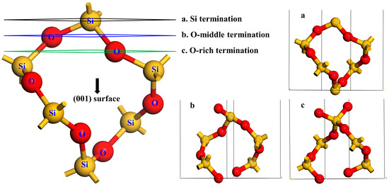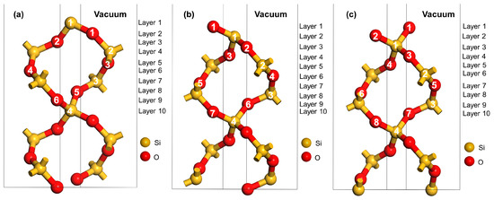 From the results of Table 1 and Table 2, it is obvious that the changes in surface energy for the different terminations are not very noticeable after simulation, which indicates that the testing range of the atomic layer number and vacuum layer thickness set in the calculation were reasonable, and the three terminations all showed a certain stability. For all of the surface terminations, it was determined that 18 atomic layers and 15 Å of vacuum is sufficient to converge the calculated surface energy. Based on convergence studies, structures for the three different surface terminations of quartz (001) were generated, as shown in Figure 3, with the atomic layers identified.