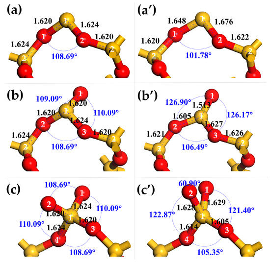 Surface structure of different terminations of the quartz (001) surface before and after relaxation from the same side view: (a) the surface structure of Si termination before relaxation; (a’) the surface structure of Si termination after relaxation; (b) the surface structure of O-middle termination before relaxation; (b’) the surface structure of O-middle termination after relaxation; (c) the surface structure of O-rich termination before relaxation; (c’) the surface structure of O-rich termination after relaxation.