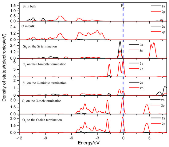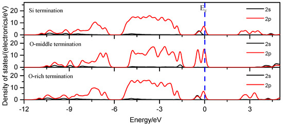 Density of states (DOS) is one of the most important parameters for describing the states of motion of electrons in solid physics. In order to obtain a chemically intuitive description of the electronic structure, a state-by-state and atom-by-atom projected density of states (PDOS) analysis can be used. It has been widely used in solid physics, surface science, and interface absorption [7,28,45,46]. For further investigation, the PDOSs of the three terminations are shown in Figure 5. The PDOSs of surface Si and O atoms compared with that of the corresponding Si and O atoms in bulk are also presented in Figure 6 in order to reveal the surface properties of different terminations. The Fermi level (EF) is referenced at 0 eV. It has been reported that the region near the Fermi level is very important for various physical and chemical properties such as conductor type, reaction activity of surface atoms, and electrochemical potential of minerals [7,20,33]. Therefore, great attention has been paid to the details near the Fermi surface.