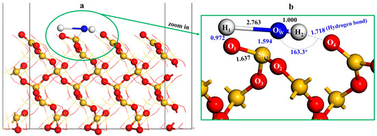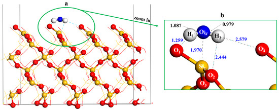 In terms of quartz surfaces, both the molecular and dissociative adsorptions have been considered based on research showing that the adsorption of water, depending on water coverage, can be either molecular or partially dissociative [25]. The optimized geometries are shown in Figure 7 and Figure 8, where the yellow and red balls represent silicon and oxygen atoms of quartz, and the blue and light gray balls represent oxygen and hydrogen atoms of water; parts of atoms are displayed as lines in order to see the whole adsorption structure clearly in Figure 7a and Figure 8a, and the zoomed-in views of the H2O adsorption structure are shown in Figure 7b and Figure 8b; the bond length of newly formed bonds after adsorption are highlighted in blue, and the unit of bond length is Å.