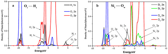 During bonding between two atoms, there are two types of bond orbitals—a bonding orbital and an antibonding orbital—that always appear in pairs. The bonding orbital is dominated by atomic orbitals with high electronegativity, whereas the antibonding orbital is dominated by atomic orbitals with low electronegativities [43]. To further investigate the bonding mechanism of H2O molecule after the dissociative adsorption, the PDOSs of O1–H1 bonding and Si1–Ow bonding in the dissociative adsorption model are given in Figure 9.