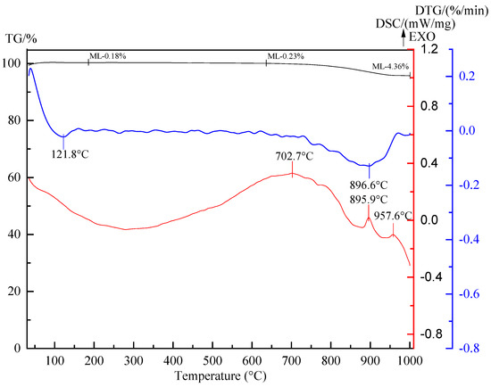 The results of thermal analyses (TG-DSC) of pure natural muscovite were obtained by simultaneous thermal analysis (STA449F3) (NETZSCH, Selb, Germany). The experiment of thermal analyses of pure muscovite was carried out under air atmosphere from room temperature to 1000 °C at a heating rate of 6 °C/min.