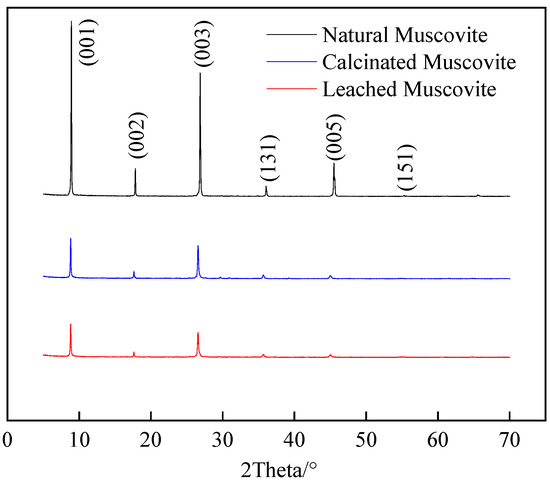 Pure natural muscovite was calcinated (at 900 °C for 5 h) and leached (2 g/sample) by H2SO4-NH4Cl solutions (0.3 mol/L H2SO4, 0.6 mol/L NH4Cl, 10 mL/g of L/S ratio) at 250 °C for 4 h. Mineral phases of pure natural muscovite, calcinated muscovite, and leached muscovite were analyzed by powder X-ray diffraction (RU-200B/D/MAX-RB). The powder X-ray diffraction (XRD) used a rotation anode high-power X-ray diffractometer (RU-200B/D/MAX-RB, Rigaku Corporation, JPN, Karlsruhe, Germany) employing CuKα radiation (λ = 0.154 nm, 40 kV, 50 mA) over scanning range 2θ = 5°–70° with step width 2°·min−1.