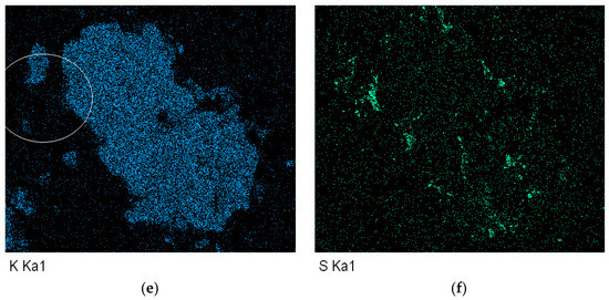 Similar results are obtained by electron probe micro-analysis. As shown in Figure 3, surface etching, edge damage, directional and interlaced fractures are the main results of the pressure leaching process. Structural damage is widely developed around muscovite surfaces (Figure 3a). With the rise of the leaching temperature, the structural damage is developed from the surface into the interior of the muscovite. Some directional fractures are produced in the internal layer of the muscovite when the leaching temperature reaches 250 °C (Figure 3c). With higher agent concentrations (Figure 3d–f), directional and interlaced fractures are quickly developed around the surface and the interior of the muscovite by the pressure leaching process. Flaky muscovite is transformed into active fragments (Figure 3d–f) with its structural damage. This indicates that the directional and interlaced fractures not only occur on the surface, but are also extended into the interior of the muscovite. The directional and interlaced fractures further lead to a whole disintegration of muscovite with their further extending. As shown in Figure 3c,f, the muscovite is destroyed into several parts along these fractures. Leaching agents can, therefore, enter into the interior of the muscovite along the fracture. The active fragments have a large specific area so as to promote leaching reactions. This indicates that the H2SO4-NH4Cl leaching system can accelerate the formation of the directional and interlaced fractures, and ultimately lead to the whole disintegration of the muscovite. Chemical dissolution of the edge of the muscovite further leads to a comminuted disintegration (Figure 3f). Leaching agents, therefore, enter into the cleavage planes of the muscovite, and further increases the cleavage plane spacing. The effects of calcination and pressure leaching on the fractures and cleavage planes lead to structural damage of the trace muscovite associated in quartz sand.