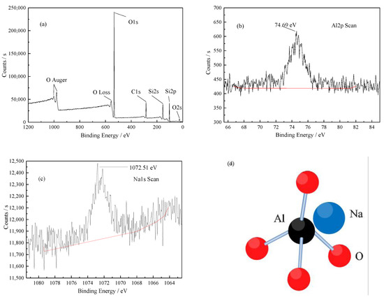 Narrow Al and Na spectra are shown in Figure 9b,c, and compared with those in the XPS handbook and native oxides, the two peaks are those of Al2O3 (74.7 eV) and Na (OX-1072.5 eV) [18,30]. Combined with replacement theory of Al and Si, the peak (74.69 eV) binding energy is the characteristic peak of the Al–O bond. As shown in Figure 9d, Al and Na replace Si in the tetrahedron [30,31,32,33,34,35]. Narrow patterns of possible lattice elements, including Fe, Li, Mg, Ti, and Ca, are not obtained. The phenomenon might be due to asymmetry distribution and low concentration of lattice impurities. XPS data show that Al is the main lattice trace element substitute in quartz and K in muscovite. Thus, the removal rate of K is more suitable for calculating the separation efficiency of trace muscovite and quartz: