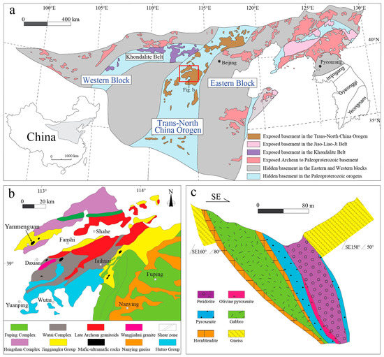 (a) Subdivisions of the North China Craton and location of the Yanmenguan mafic–ultramafic complex (modified after [38]). (b) Simplified geological map of the Hengshan–Wutai–Fuping area (modified after [43]). (c) Geological sketch map of the Yanmenguan complex, showing the major rock units of peridotite, olivine pyroxenite, pyroxenite, hornblendite, gabbro, and the surrounding Archean gneiss as a country rock. Note that the lithological units are zonal patterns in the vertical section (modified after [43]).