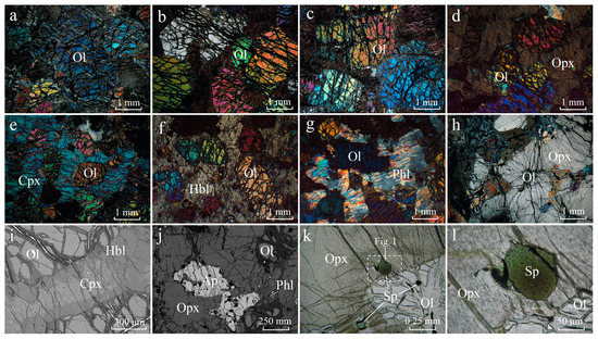 Polarized optical images and back-scattered electron images of ultramafic suits: (a–c) Olivine (Ol) occurring as cumulate crystals and partially serpentinized; (d) Olivine crystals surrounded by enstatite (Opx); (e) Olivine crystals surrounded by diopside (Cpx); (f) Olivine surrounded by tschermakite (Hbl); (g) Olivine surrounded by phlogopite (Phl). (h) Enstatite-hosted olivine with radial fractures. (i) Resorption-induced rim of tschermakite around diopside (j) Chlorapatite (Ap)–phlogopite pairs; (k) Three different appearances of Cr-spinel (Sp) in enstatite and olivine under polarizing microscope; (l) Zoned Cr-spinel under a polarizing microscope.