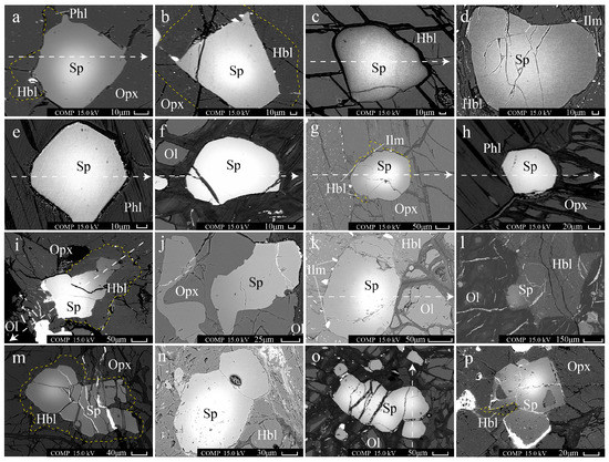 Back-scattered electron images of Cr-spinel (Sp), and the arrows denote the trend of compositional profiles: (a,b) Zoned Cr-spinel surrounded by enstatite (Opx) along with tschermakite (Hbl) and phlogopite (Phl); (c,d) Zoned Cr-spinel surrounded by tschermakite carrying ilmenite (Ilm), showing the seeming disconnection between the reverse zonation and the crack in Cr-spinel; (e) Zoned Cr-spinel surrounded by phlogopite; (f) Zoned Cr-spinel surrounded by olivine; (g) Interstitial zoned Cr-spinel located between tschermakite and enstatite; (h) Interstitial zoned Cr-spinel located between phlogopite and enstatite; (i,j) Interstitial asymmetrically-zoned Cr-spinel located between olivine and enstatite; (k,l) Interstitial asymmetrically-zoned Cr-spinel located between olivine and tschermakite; (m–p) Cr-spinel cluster enclosed in enstatite, tschermakite, and olivine, with only relatively large Cr-spinel grains showing zonation.