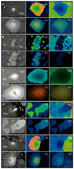 Elemental mapping images of zoned Cr-spinel (Sp): (a) Zoned Cr-spinel surrounded by enstatite (Opx); (b) Cr-spinel cluster enclosed in olivine (Ol); (c) Interstitial zoned Cr-spinel located between tschermakite (Hbl) and enstatite (Opx) (d) Interstitial zoned Cr-spinels located between olivine and enstatite; (e) Interstitial zoned Cr-spinel located between olivine and tschermakite.