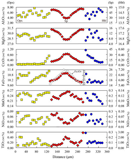 For major elements, compositional profiles of minerals as well as back-scattered electron images were obtained by wavelength-dispersive spectrometry (WDS) using a JEOL JXA8100 electron probe at the State Key Laboratory of Lithospheric Evolution, IGGCAS, Beijing, China, operating at an accelerating voltage of 15 kV, 12 nA beam current, 5 μm beam spot size, and 10–30 s dwell time as well as 11 mm working distance. The elements were acquired using three crystals as follows: LIFH for Cr, Mn, Fe, and Ni, PETJ for K, Ca, and Ti, and TAP for Na, Mg, Al, and Si. The standards used were albite for Na, diopside for Si, Ca, and Mg, haematite and synthetic Cr2O3 for Cr, synthetic TiO2 for Ti, orthoclase for K, synthetic Al2O3 for Al, synthetic MnO for Mn and synthetic NiO for Ni. K(α) lines were selected for analysis, and the detection limits were in the range of 0.008~0.02 wt % (1σ). The spacing of points in the profiles was within 10~15 μm and traversed the Cr-spinel and paired silicates. Matrix effects were corrected by a program based on the ZAF procedure. Fe2+–Fe3+ redistribution from electron microprobe analyses was carried out using the general equation for estimating Fe3+ defined by Droop [46]. The profiles of reverse-zoned Cr-spinel in and among different silicate minerals are provided in supplementary materials.
