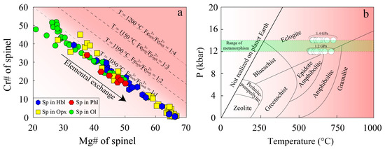 (a) Cr-spinel empirical thermometer after Sack and Ghiorso [58]. The equipotential curves and Fe3+/Fe2+ of melt are from Irvine [1] and Agata and Adachi [33]. Equipotential curves shifting to the left represent magmatic differentiation, and the paralleled arrow denotes the trend of elemental exchange. (b) Olivine–spinel thermometer after Ballhaus [59]. The compositions for temperature estimates based on the rim of spinel and co-existing olivine. The presupposed pressures (1.2 and 1.4 GPa) are from Wang et al. [39]. Data are available in supplementary material. P–T diagram with eight principal metamorphic facies is from Spear [60].