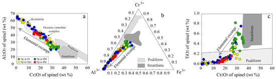 Chemical compositions of spinel, compared with spinel from different tectonic settings on (a) Cr2O3 vs. Al2O3 (b) Cr2O3 vs. Al2O3 vs. Fe2O3 (c) TiO2 vs. Cr2O3 diagrams. The komatiite and oceanic cumulate complex fields are from Kamenetsky et al. [5]. Podiform and stratiform fields are from Musallam et al. [102] and Arai et al. [103].