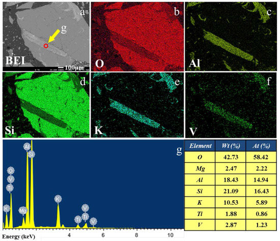Figure 1 presents the backscattered electron image (BEI) and representative elemental EDS maps of O, Al, Si, K, and V of decarbonized stone coal. As can be seen from Figure 1, the dark gray zones in BEI are composed of Si and O, and it is inferred to be quartz. The light gray zones in BEI belong to potassium-rich aluminosilicate containing O, Al, Si, and K. As mentioned in Section 2.1, in this stone coal, the mineral phases of potassium-rich aluminosilicate are only muscovite and feldspar. The micro-area elemental analysis shows that the Al content of point g in the light gray zone of BEI is 18.43% (Figure 1g). The Al contents of muscovite (KAl2(AlSi3O10)(OH)2) and feldspar (KAlSi3O8) are 20.98% and 9.71%, respectively. Hence, it is inferred that the mineral phase in the light gray zone is muscovite. It is observed that the distribution of Al (Figure 1c) and V (Figure 1f) correlates well with the light gray zone of BEI (Figure 1a). Since V(III) and V(IV) have similar ionic radius and electronegativity, and the same coordination number to Al(III); they readily replace Al(III) from dioctahedral structure as isomorphism in muscovite [19]. The correlation between Al and V distribution indicates the vanadium in the stone coal exists as isomorphism in muscovite, which is the most representative and prevalent occurrence of vanadium in stone coal [3].