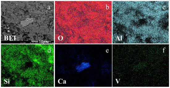 (a) BEI of the third type of vanadium-bearing grain in water leaching residue, EDS elemental distribution: (b) O, (c) Na, (d) Al, (e) Si, and (f) V.