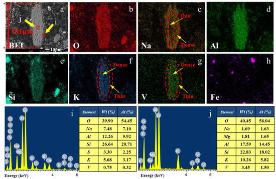 The BEI and representative elemental EDS maps of acid leaching residue are shown in Figure 5. The distribution of Na, K, and V, as marked by irregular polygon, is heterogeneous (Figure 5c,f,g). The distribution of Na is denser in the outer margin and thin in the interior of the grain, while distribution of K and V are thin in the interior and denser in the outer margin of the grain. The micro-area elemental analysis at the outer margin and interior of the grain was carried out. It is observed that the elemental composition at the outer margin is with values of 42.37%, 5.76%, 12.82%, 28.79%, and 4.58% for O, Na, Al, Si, and K, respectively (Figure 5i), which is close to the chemical composition of K-Na-feldspar, and it is inferred as K-Na-feldspar. Similarly, the mineral phase in the interior of the grain is identified as muscovite. Consequently, the vanadium in acid leaching residue presents in the muscovite surrounded by K-Na-feldspar, which is in good agreement with the second type of vanadium occurrence in water leaching residue.