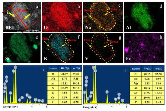 (a) BEI of the second type of vanadium-bearing grain in water leaching residue, EDS elemental distribution: (b) O, (c) Na, (d) Al, (e) Si, (f) K, (g) V, (h) Fe, and EDS spectra collected from BEI as marked by circle (i) at the outer margin and (j) at the interior of grain.