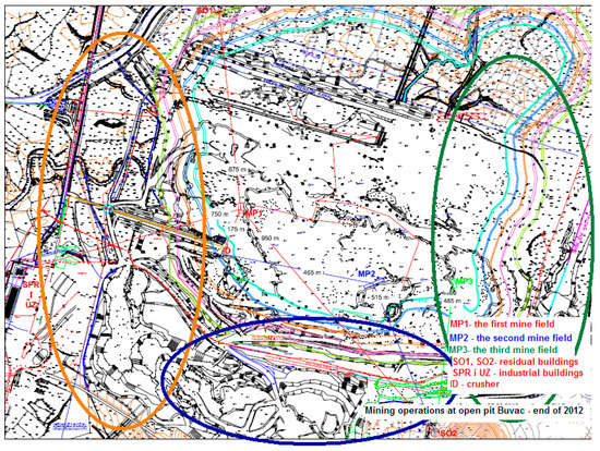 - The determined distances by graphical maps:Distance of the nearest minefield in the southwestern zone from an industrial facility—crusher (MP1): 175 mDistance of the nearest minefield in the southwestern zone from residential object SO1 (MP1): 675 mDistance of the nearest minefield in the southwestern zone from residential object SO2 (MP1): 950 mDistance of the nearest minefield in the southwestern zone of industrial facilities—building SPR and administrative building UZ (MP1): 750 mDistance of the nearest minefield in the central southern zone from an industrial facility—crusher (MP2): 465 mDistance of the nearest minefield in the central southern zone from residential object SO2 (MP2): 515 mDistance of the nearest minefield in the south-eastern zone from residential object SO3 (MP3): 485 m