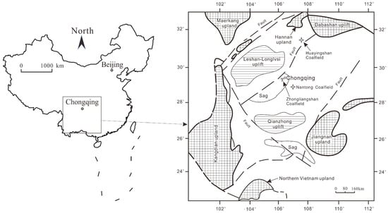 The Zhongliangshan Coalfield, located in the eastern Sichuan Basin, is one of the main coal resource bases in Chongqing Municipality (Figure 1). Previous studies have shown that the dominant terrigenous material of the Lopingian coals in the Sichuan Basin is basaltic Kangdian Upland [12]. However, it has been reported recently that the dominant terrigenous materials for the Lopingian coals in the Huayingshan and Nantong coalfields, Sichuan basin are three Uplands/uplifts (TUUs), namely Leshan–Longnvsi Uplift, Dabashan Uplift and Hanan Upland rather than the Kangdian Upland [8,13]. However, the sediment source region of the Lopingian coals in the Zhongliangshan Coalfield is not known. In addition, we have reported an anomalous enrichment of critical metals (Nb, Ga, and REY) in the tuff underlying the coal in the Zhongliangshan Coalfield, which can be regarded as a potential economically significant coal-bearing stratum hosting a polymetallic ore deposit [14,15]. The concentrations of rare metals in the Lopingian coals overlying the tuff layer need further investigation.
