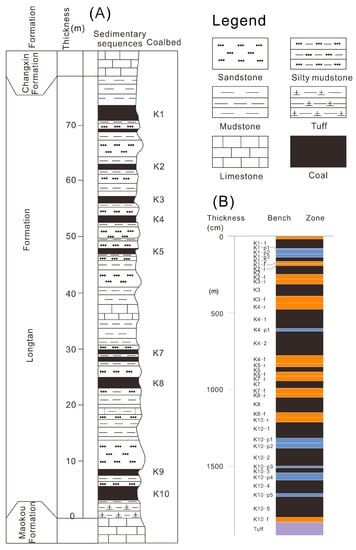 Sedimentary sequences of the Zhongliangshan Coalfield (A) and the collected samples of the ZK4-1 drill core in present study (B). Partings in blue, host rocks (roof and floor strata) in orange, tuff in purple, and coal benches in black. The suffixes r, f, and p stand for roof, floor, and partings, respectively.