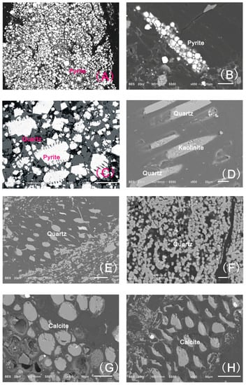 SEM back scattering images of minerals in the Zhongliangshan coals. (A) euhedral pyrite in sample K1-1; (B) euhedral pyrite in sample K10-4; (C) pyrite in sample K7-1; (D) cell-filling quartz and kaolinite in sample K1-2; (E) cell-filling quartz in sample K5-1; (F) quartz in sample K4-2; (G) cell-filling calcite in sample K4-2; (H) cell-filling calcite sample K4-2.