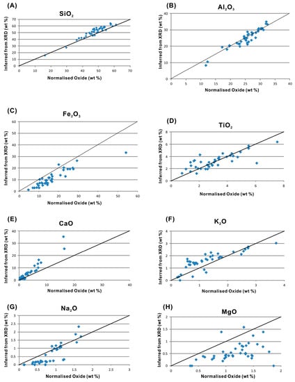 Based on the calculation methods described by Ward et al. [27], the reliability of the quantitative XRD data was checked by the comparison with the observed ash chemistry determined by XRF. Before the comparison, data from the two methods were both normalized to allow for difference in LTA, CO2, H2O+, and SO3 percentages [46]. The correlations of SiO2, Al2O3, K2O, Fe2O3, TiO2, CaO and MgO are revealed in Figure 6.
