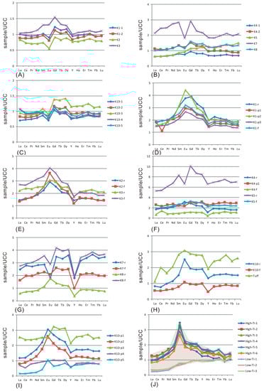Upper Continental Crust-normalized REY patterns of samples from the Zhongliangshan coals (A–C); non-coal bands (D–I); and Emeishan high-Ti and low-Ti basalts (J). Note: the data of high-Ti and low-Ti are from Huang et al. [67].
