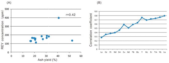 Relations between REY and ash yield (A); and between REY-ash correlation coefficients and REY atomic number (B).