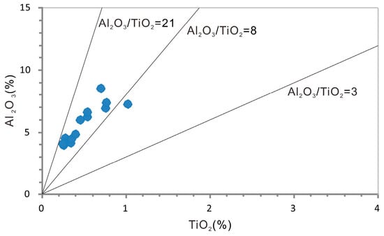 Many studies have shown that the Al2O3/TiO2 ratios are useful provenance indicators to determine the terrigenous materials not only for normal sedimentary rocks but also for coal seams [8,10,73,75,76]. It is suggested that the Al2O3/TiO2 ratios for sedimentary rocks with 3–8, 8–21, and 21–70 are considered to originate from mafic-, intermediate-, and felsic dominated sediment source regions, respectively [75]. In the plot of Al2O3 vs. TiO2 for coal samples from the Zhongliangshan coalfield (Figure 11), almost all coal samples fall in the area between 8 and 21, indicating that the terrigenous source of the studied samples is of intermediate composition. This further indicates that the dominant sediment source region is not the mafic basalts of the Kangdian upland, where the typical Al2O3/TiO2 ratios are between 3 and 8 [76].