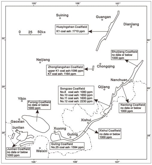 - Dai, S.; Luo, Y.; Seredin, V.V.; Ward, C.R.; Hower, J.C.; Zhao, L.; Liu, S.; Zhao, C.; Tian, H.; Zou, J. Revisiting the late Permian coal from the Huayingshan, Sichuan, southwestern China: Enrichment and occurrence modes of minerals and trace elements. Int. J. Coal Geol. 2014, 122, 110–128. [Google Scholar] [CrossRef]