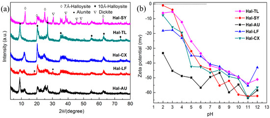 (a) XRD patterns of powdered samples of halloysite minerals; (b) Zeta potential measurements for different halloysite samples.